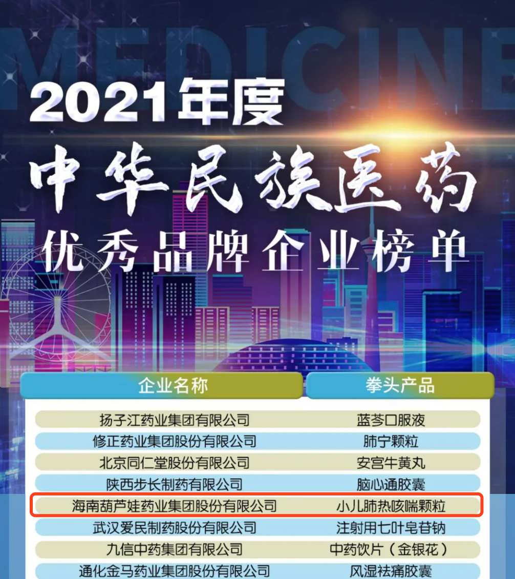 12月29日,全国工商联医药业商会发布了“2021年度中华民族医药优秀品牌企业榜单”,金沙城药业集团凭借黄金单品小儿肺热咳喘颗粒(4克)实力登榜。