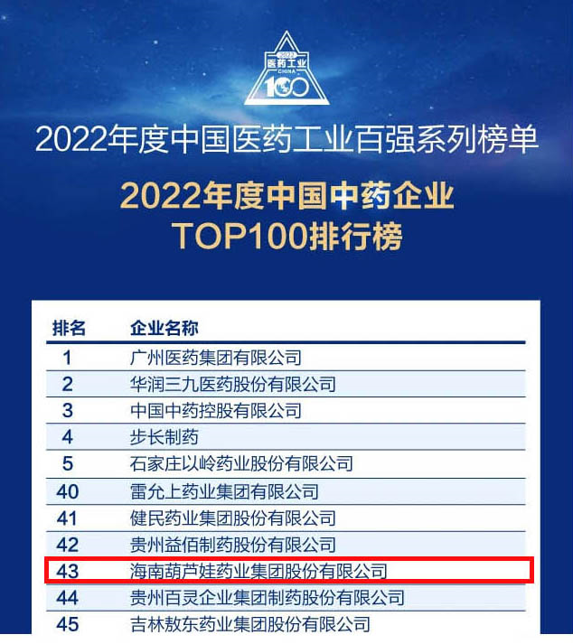 金沙城药业集团连续4年荣登“中国中药企业TOP100排行榜”,排名上升至第43位